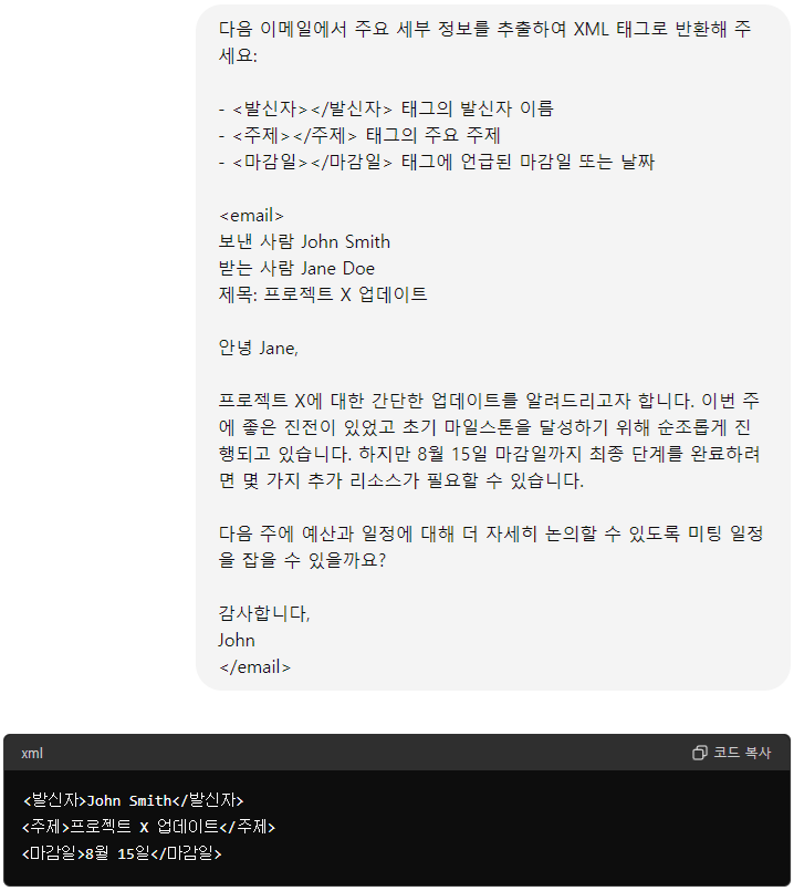 XML 태그는 콘텐츠를 구조화하고 의미를 부여하는 데 효과적입니다. LLM에 특정 값, 명사, 또는 텍스트 뭉치를 정확히 가리키고 싶을 때 사용할 수 있습니다.