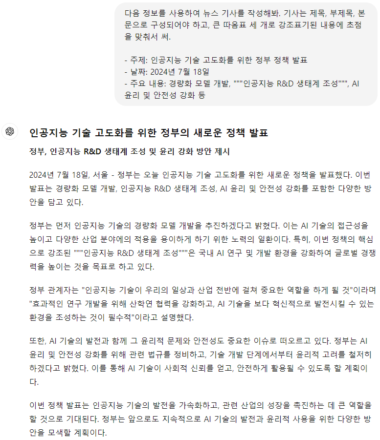 지시 사항에서 같은 중요도로 취급될 수 있는 '주요 내용'들 중에서도 강조할 주제를 특정하기 위해 큰 따옴표를 사용했고, 실행해보니 실제로 적절히 반영되어 있음을 알 수 있습니다.