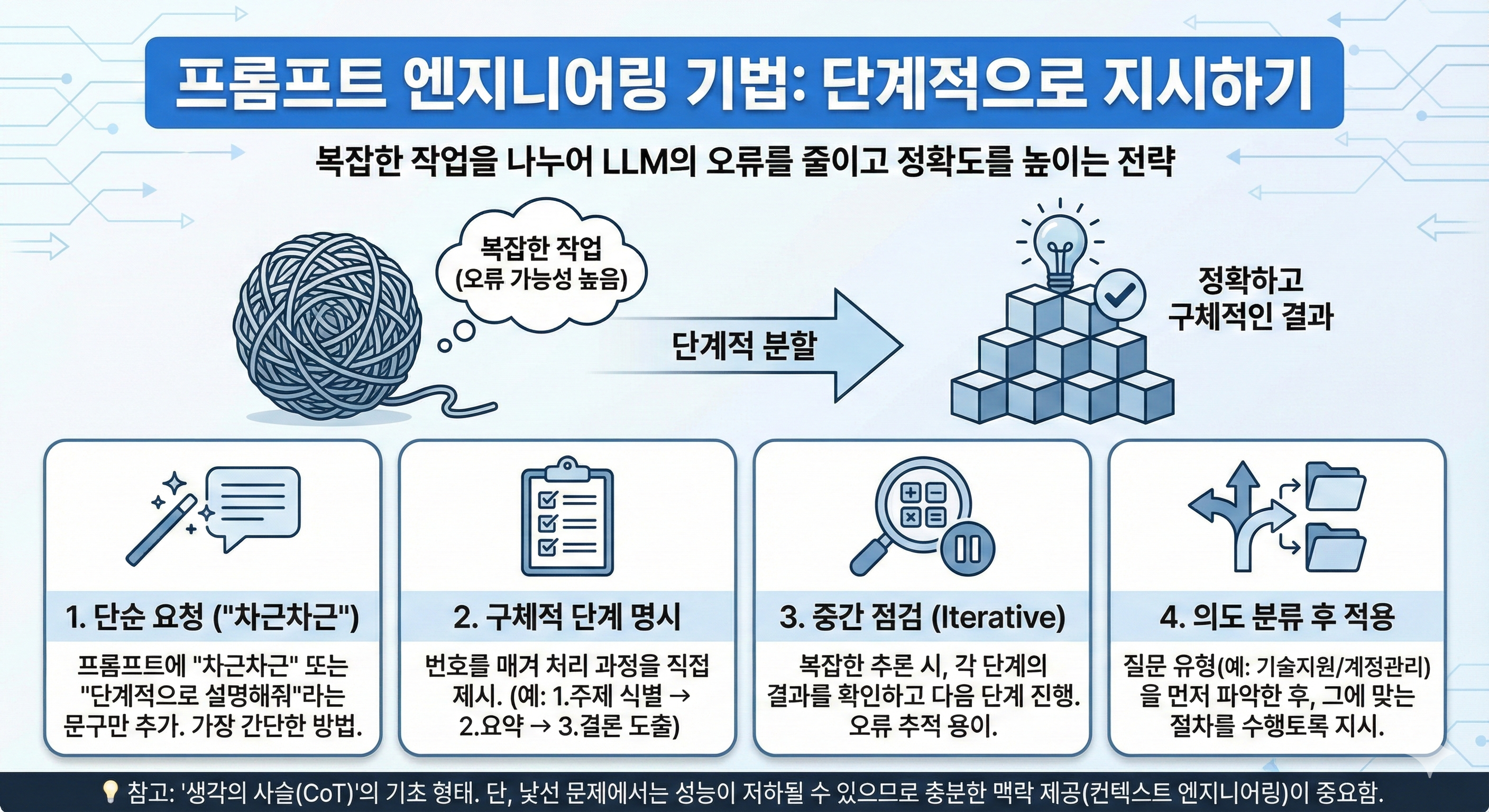 단계적 지시는 말 그대로 복잡한 작업을 더 작고 단순한 작업들으로 나누는 것입니다. 사람이 언제든 실수를 할 수 있는 것처럼, LLM도 마찬가지입니다. 더구나 사람에겐 비교적 간단한 작업/사고 과정일지라도 알고 보면 차근차근 생각해야 하는 것들이 있습니다. 이러한 경우에 '단계적 지시'를 통해 LLM이 각 단계를 차례대로 처리하여 더욱 정확하고 구체적인 결과를 제공할 수 있습니다.