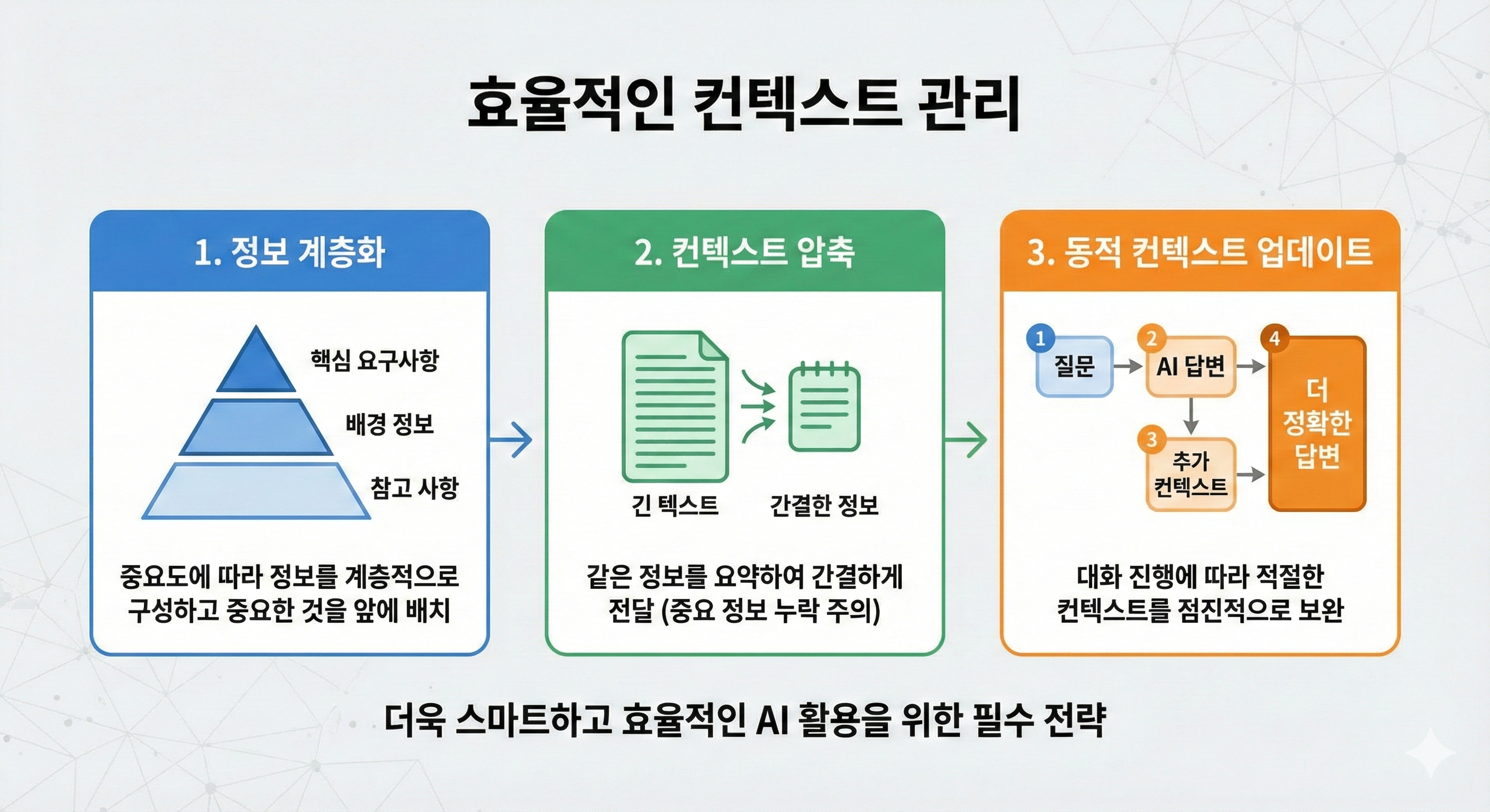 한편, 컨텍스트 엔지니어링이 '무엇을'에만 집중하는 것은 아닙니다. '어떻게'의 측면에서 효과적이라고 알려진 컨텍스트 관리 기법들도 다음과 같이 정리할 수 있습니다.