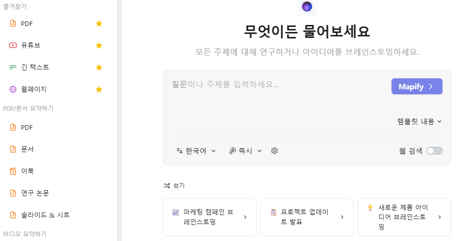 - 다양한 입력 형식 지원 : YouTube 영상, PDF 문서, 오디오 파일, 웹페이지, 사진, 차트, 스캔된 노트 등 모든 형식의 콘텐츠를 업로드하면 AI가 자동으로 분석하고 핵심 정보를 추출하여 마인드맵으로 변환