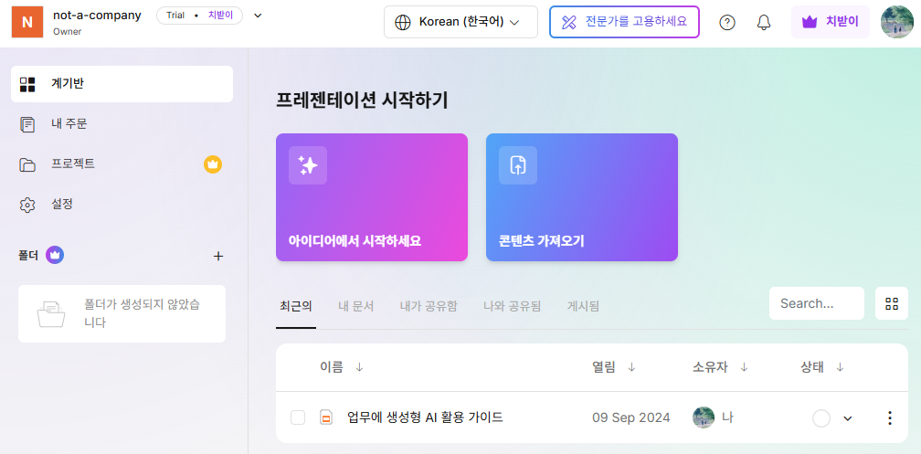 - 간편한 텍스트 기반 생성 : 간단한 문장이나 아이디어만 입력하면 AI가 콘텐츠를 분석하고 자동으로 완성도 높은 슬라이드를 생성