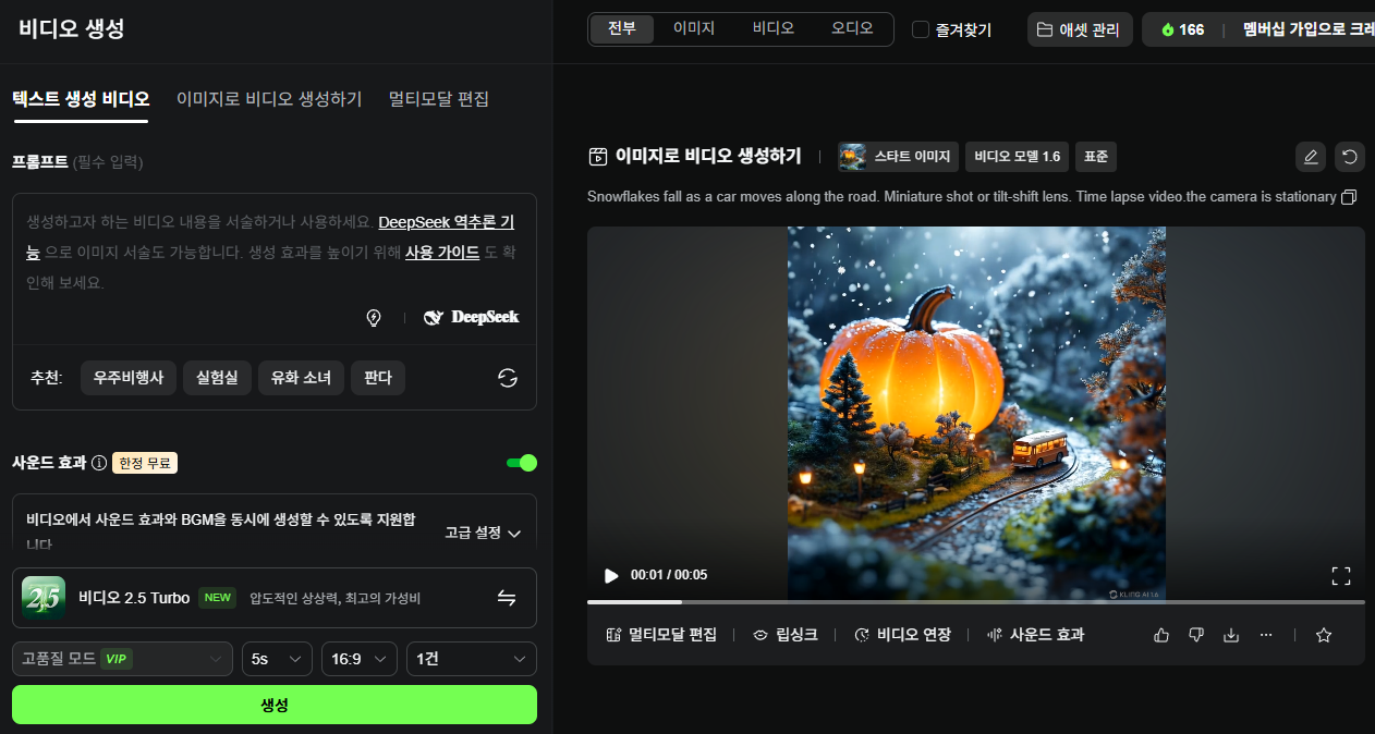 ▶ 개요 : 최신 Kling 2.5 Turbo 모델을 통해 텍스트로부터 고품질 비디오 및 이미지 생성이 가능한 AI 서비스입니다.