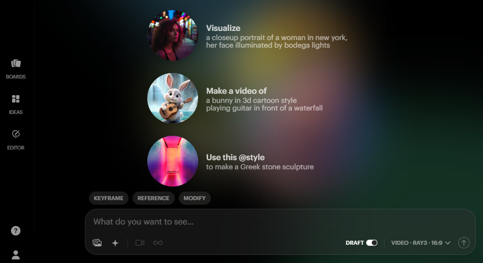 - Ray3 모델 : 16-bit HDR 컬러로 스토리를 전달하는 최신 비디오 모델, 프로 스튜디오 파이프라인 지원