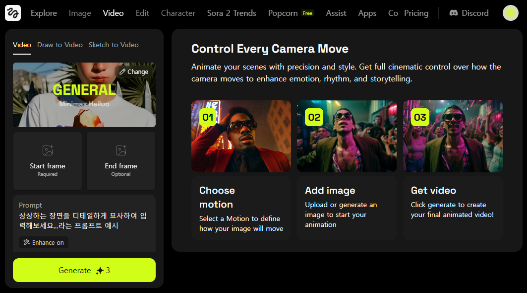 - 다양한 스타일 : 현실적, 시네마틱, 애니메이션 등 다양한 스타일로 생성 가능