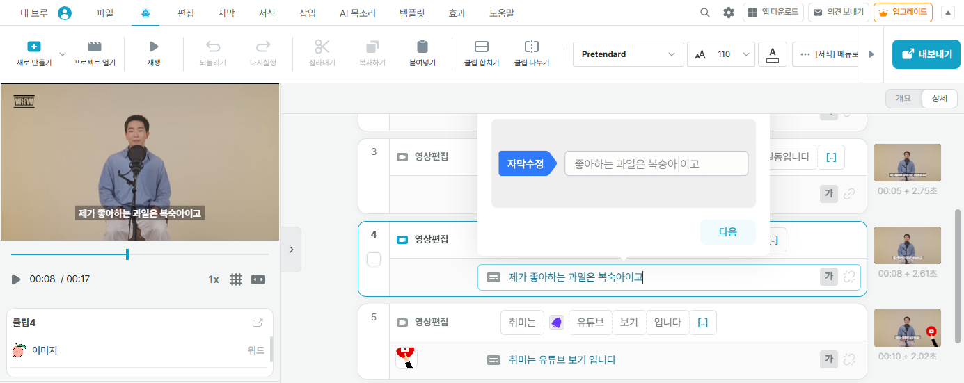 - AI 음성 합성 : 자막을 AI 음성으로 변환하여 보이스오버 생성