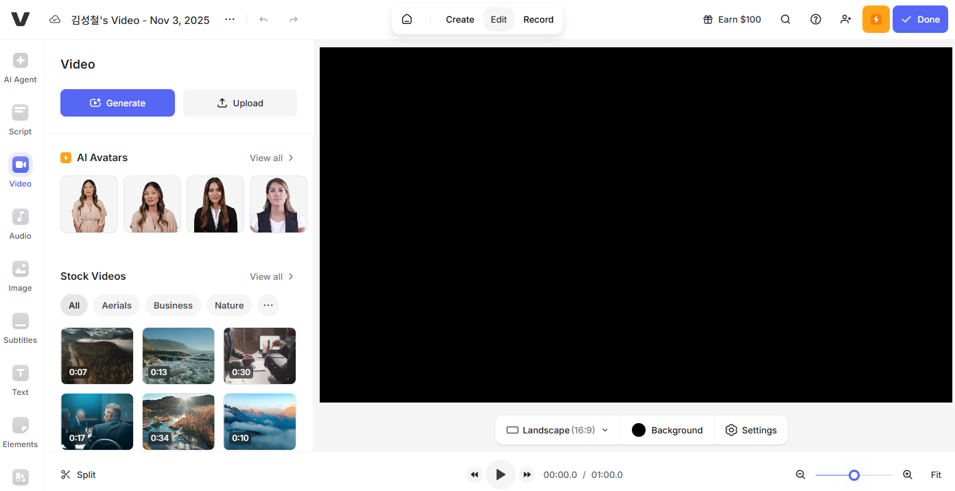 - AI 스크립트 생성 : 전체 비디오 스크립트를 AI가 자동 작성