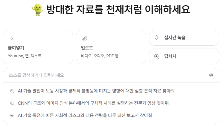 - 다양한 자료 형식 지원: 유튜브 영상, 회의 녹취 음성, PDF 문서, 웹페이지, 일반 텍스트 등 다양한 형식의 자료를 URL 또는 파일 업로드로 요약