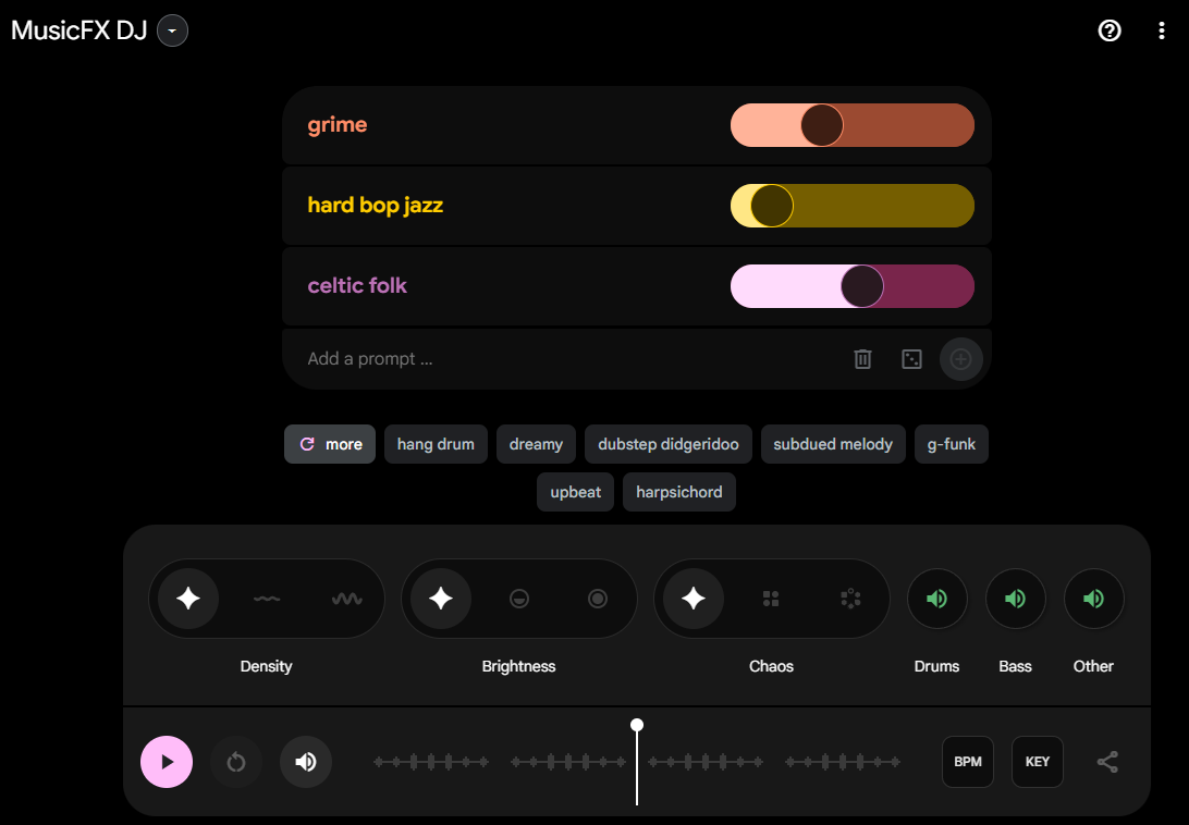 ▶ 개요 : Google DeepMind의 Lyria 및 Lyria RealTime 모델 기반 AI 음악 생성 도구로, MusicFX는 텍스트 프롬프트로 음악을 생성하고 MusicFX DJ는 실시간으로 여러 음악을 레이어링하고 믹싱하는 인터랙티브 DJ 경험을 제공합니다.