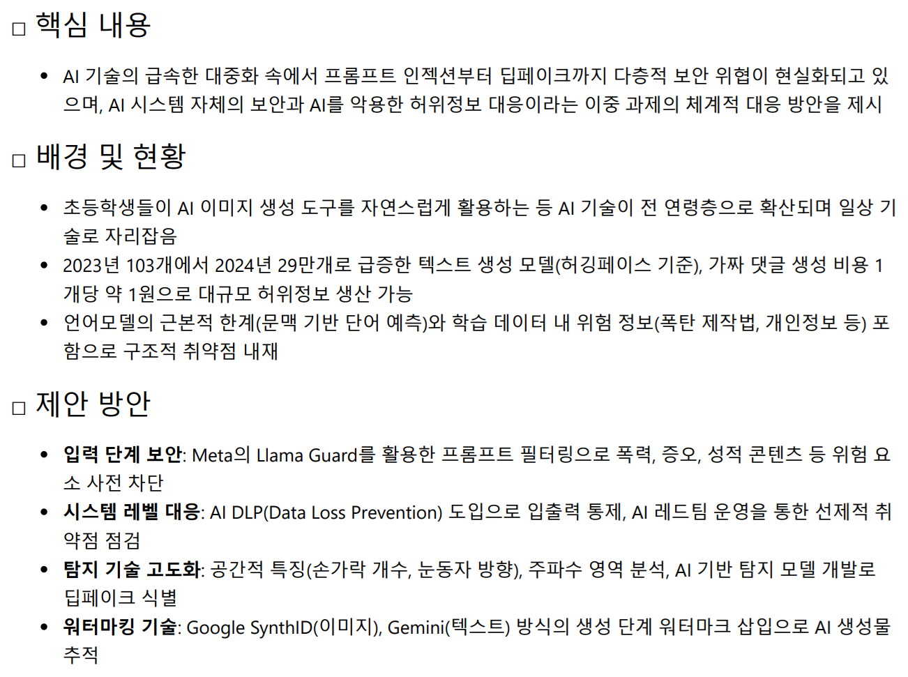 핵심 내용: (D부분/결론) AI 보안 위협에 체계적 대응 필요