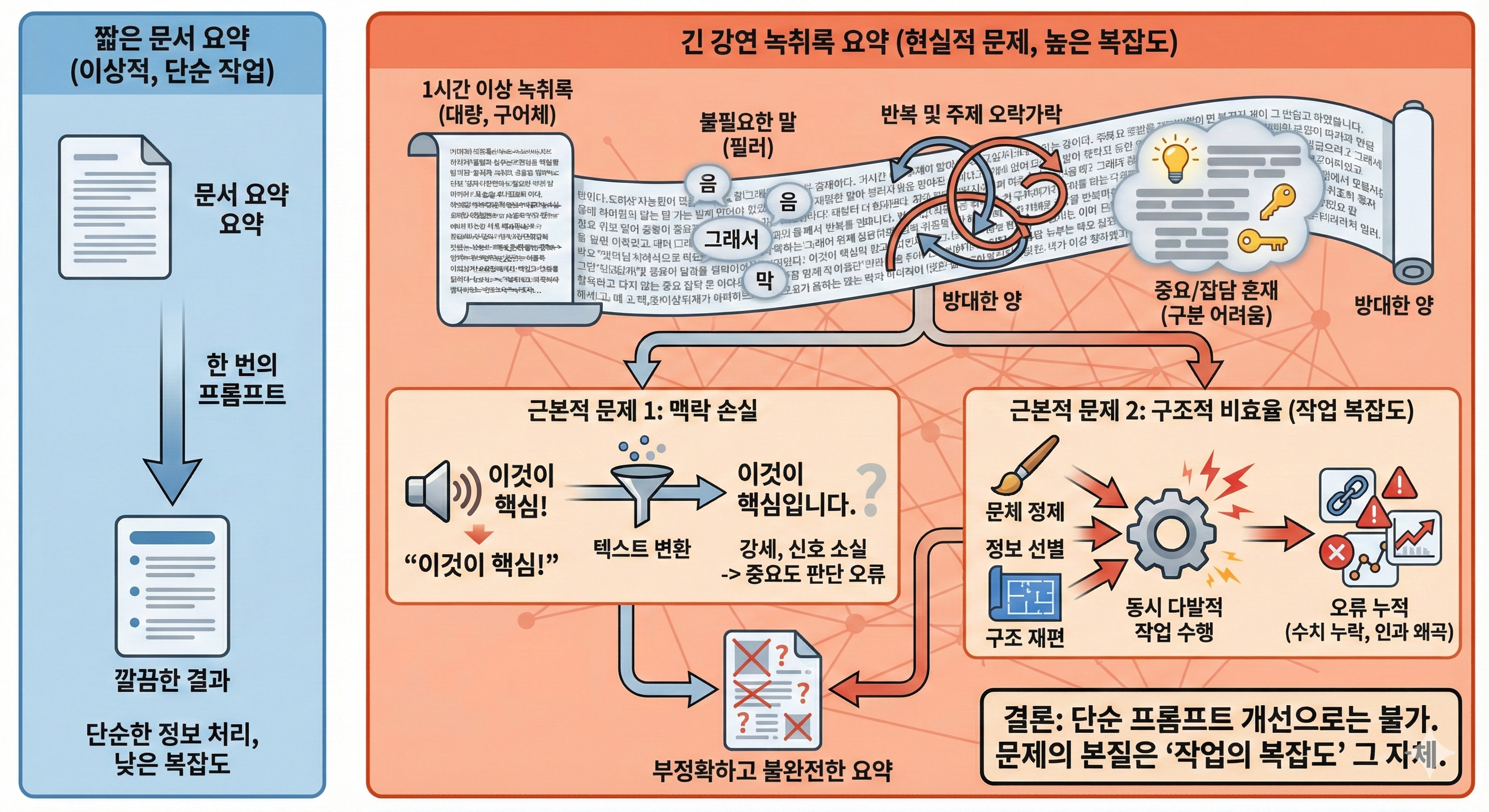 여기에 더해, 녹취록에서는 맥락 손실과 구조적 비효율이라는 두 가지 근본적 문제가 있습니다.